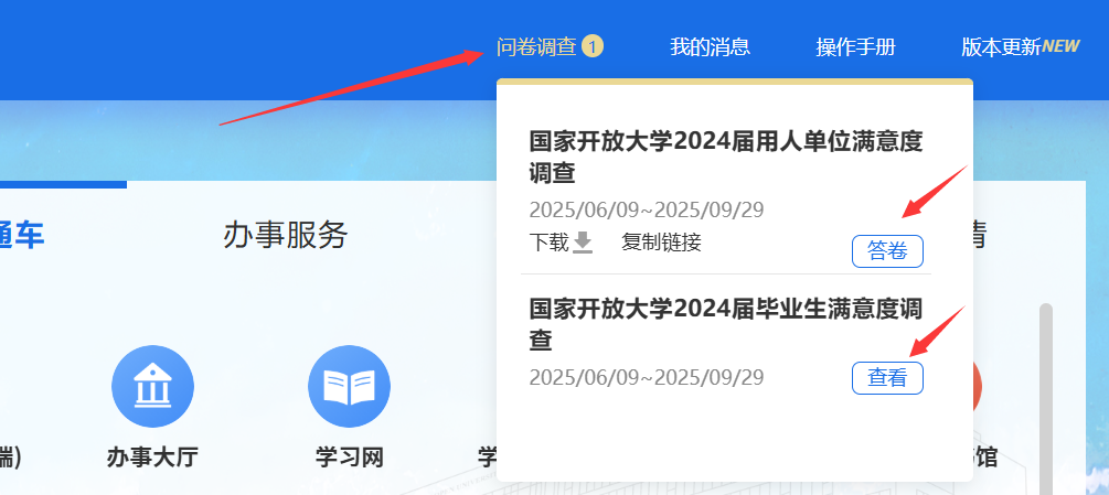 请学生到校领取毕业证前,登录国开学习网,点击导航栏上方的问卷调查,完成毕业生满意度调查和用人单位满意度调查。(感谢您的大力支持和配合,非常感谢)